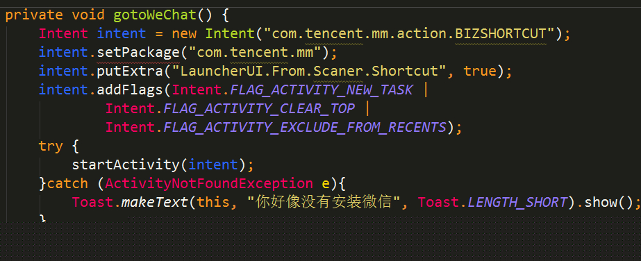 private void gotoWeChat () { Intent intent = new Intent("com.tencent.mm.action.BIZSHORTCUT" ); intent.setPackage("com.tencent.mm" ); intent.putExtra("LauncherUI.From.Scaner.Shortcut" , true ); intent.addFlags(Intent.FLAG_ACTIVITY_NEW_TASK | Intent.FLAG_ACTIVITY_CLEAR_TOP | Intent.FLAG_ACTIVITY_EXCLUDE_FROM_RECENTS); try { startActivity(intent); }catch (ActivityNotFoundException e){ Toast.makeText(this , "你好像没有安装微信" , Toast.LENGTH_SHORT).show(); } }