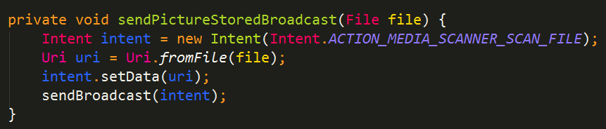 private void sendPictureStoredBroadcast (File file) { Intent intent = new Intent(Intent.ACTION_MEDIA_SCANNER_SCAN_FILE); Uri uri = Uri.fromFile(file); intent.setData(uri); sendBroadcast(intent); }