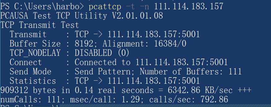 Usage: pcattcp -t [-options] host [ < in ] pcattcp -r [-options > out] Common options: -l ## length of bufs read from or written to network (default 8192) -u use UDP instead of TCP -p ## port number to send to or listen at (default 5001) -s toggle sinkmode (enabled by default) sinkmode enabled: -t: source (transmit) fabricated pattern -r: sink (discard) all received data sinkmode disabled: -t: reads data to be transmitted from stdin -r: writes received data to stdout -A align the start of buffers to this modulus (default 16384) -O start buffers at this offset from the modulus (default 0) -v verbose: print more statistics -d set SO_DEBUG socket option -b ## set socket buffer size (if supported) -f X format forrate: k,K = kilo{bit,byte}; m,M = mega; g,G = giga -c -t: send continuously -r: accept multiple connections sequentially -R concurrent TCP/UDP multithreaded receiver Options specific to -t: -n ## number of source bufs written to network (default 2048) -D don't buffer TCP writes (sets TCP_NODELAY socket option) -w ## milliseconds of delay before each write (default 0) -L ## desired transmit data rate in bytes/second Options specific to -r: -B for -s, only output full blocks as specified by -l (for TAR) -T "touch": access each byte as it's read